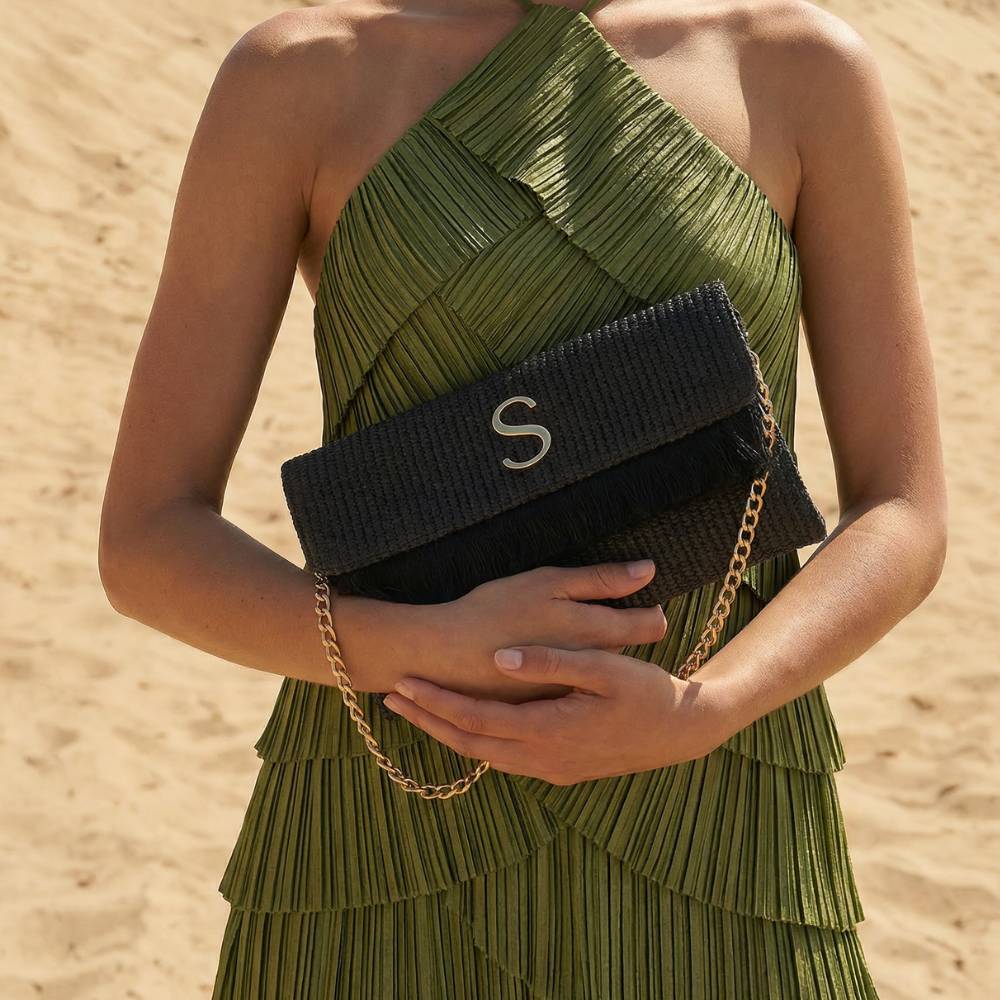 SORENA Harites Ithacas Clutch Bag Black clutch bag with magnetic closure and gold chain.